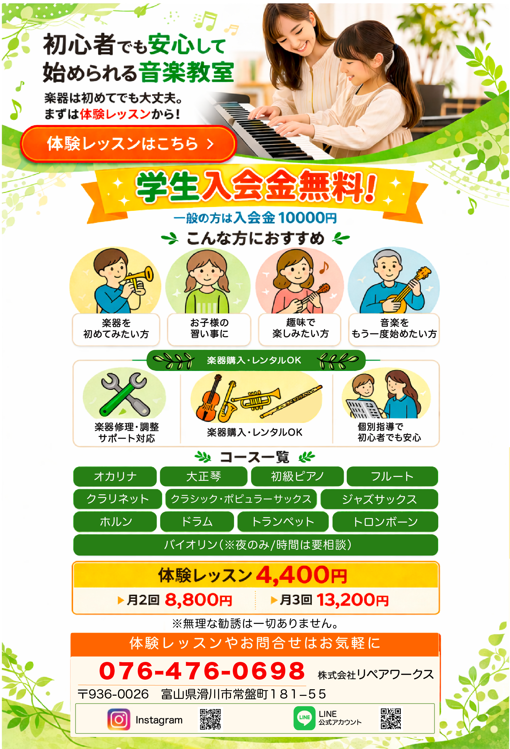 夏季休業のお知らせになります。 - 2025.04.29NEWS音楽教室レッスン料金改定のご案内